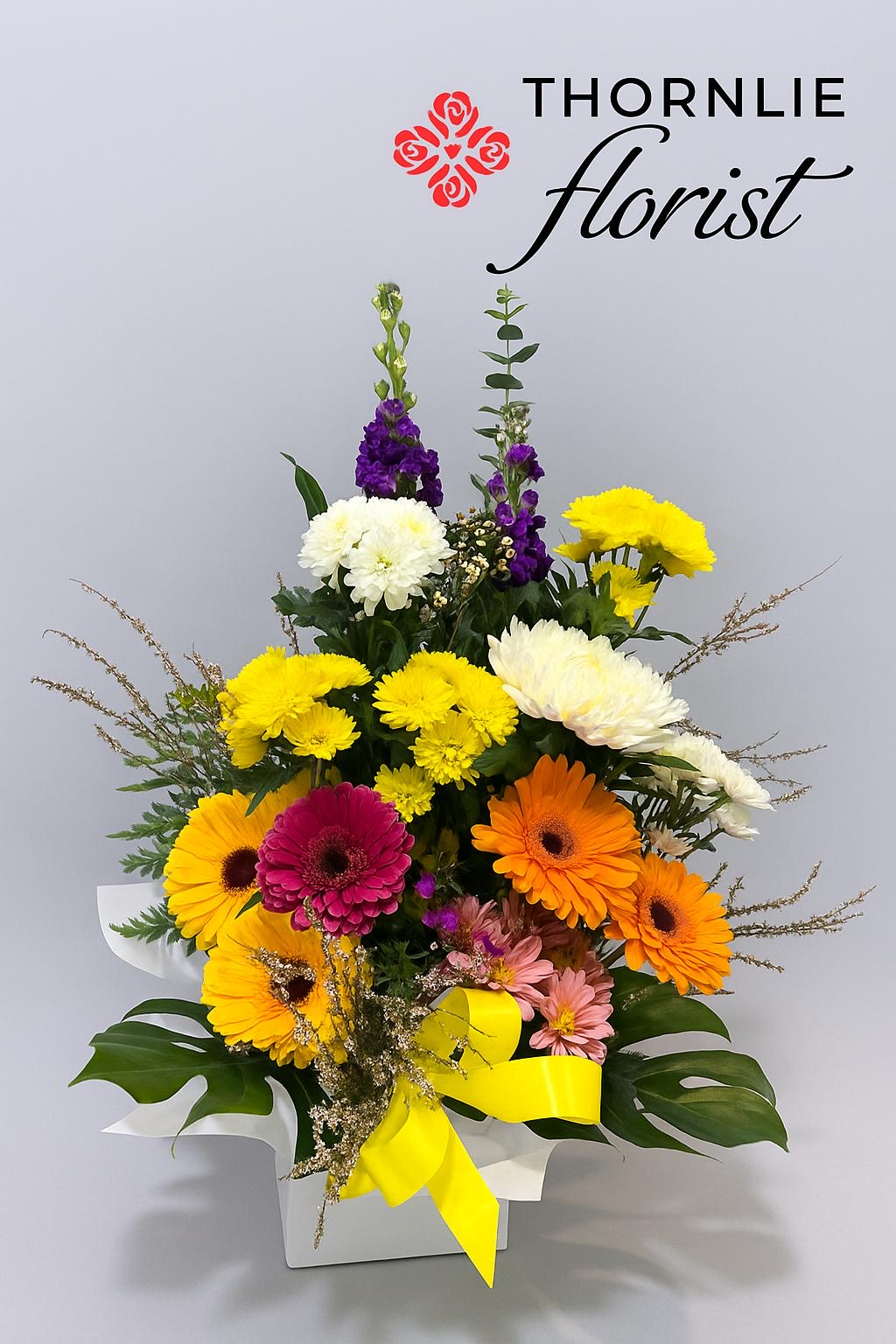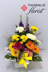 A joyful medley of fresh blooms, this arrangement features bright yellow chrysanthemums, classic white disbuds, vibrant gerberas in orange, pink, yellow, and magenta, accented with delicate snapdragons, statice, and lush greenery. Presented in a sleek white box and tied with a cheerful yellow ribbon, this design is perfect for birthdays, thank you gifts, or any occasion that calls for colour and happiness.